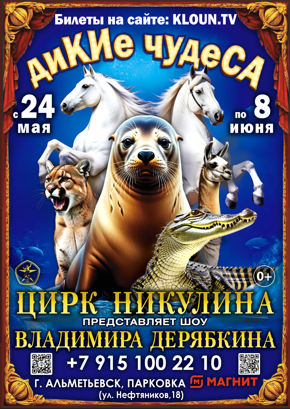 Цирк Никулина представляет новое шоу Владимира Дерябкина "диКИе чудеСА". В программе: большой аттракцион с животными - пони, ламы, верблюды, крокодилы, лошади, пумы, а также Канадское колесо Сира, лазерное шоу, ментальная магия, голограмма. Сенсация! Мировой аттракцион гигантов моря - морских львов. Дрессировщик, обладатель высших международных наград -Василий Тимченко. Все представление любимец публики, клоун Владимир Дерябкин. Представления сопровождает оркестр.